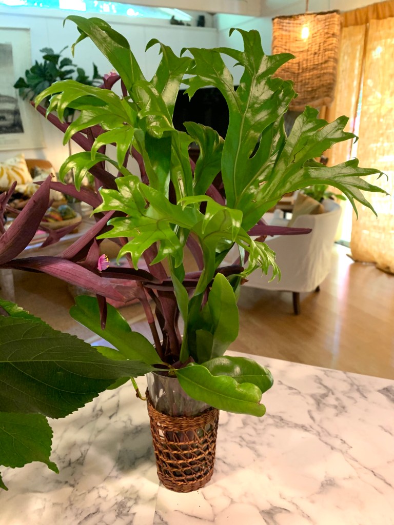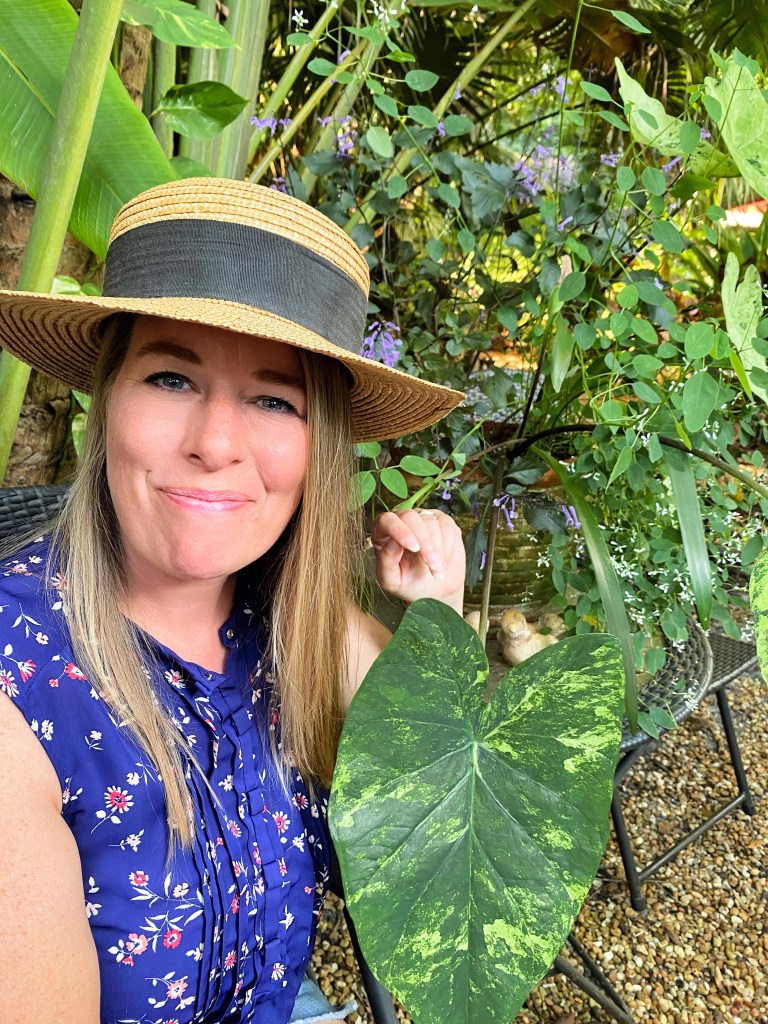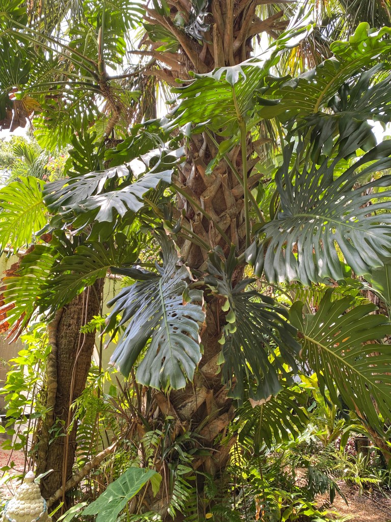 Linda, the owner, gave me a garden tour and I learned so much. She’s incredibly knowledgable, sweet, and generous, and answered all my questions. The first thing that struck me was how tall the trees and plants were. Some of them are houseplants familiar to me, except that they were taller than a two-story house! For example, remember my monstera plant from the last blog (mine’s about 3 feet high)? This one…