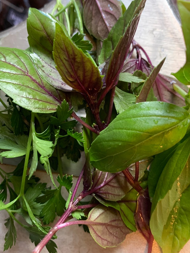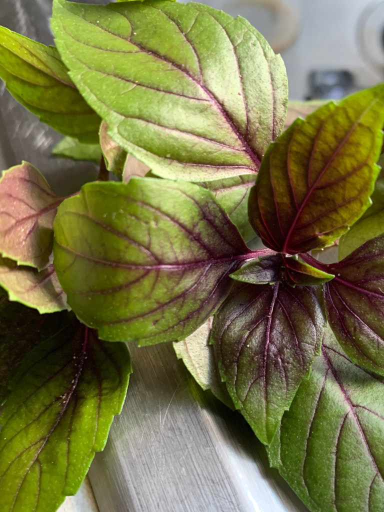 The other thing that takes the flavor over the top is basil. You can sprinkle it over the top or mix it in with the mayo. I used purple basil…look how pretty! I love how purple basil can range from dark purple to green with purple veins. It tastes exactly like most other kinds of basil to me, but I think it’s so much more fun to use purple produce…”because purple heads will not be denied!”