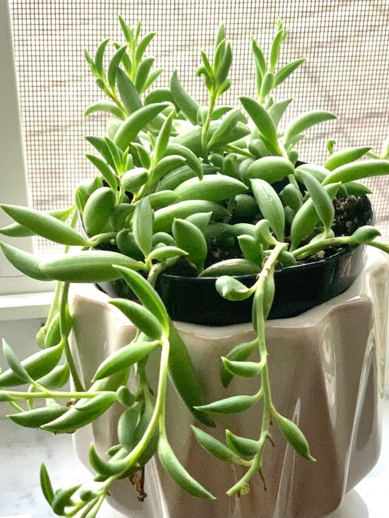 Pro tip: If you buy (or already have) a donkey’s tail, take all the little leaves that fall off when you even look at it funny and toss them back in the pot. They start growing new shoots. That’s what all of those shorter strands sticking up at the top in the current photo are from. Below is what it looked like when I first bought it in August 2020.