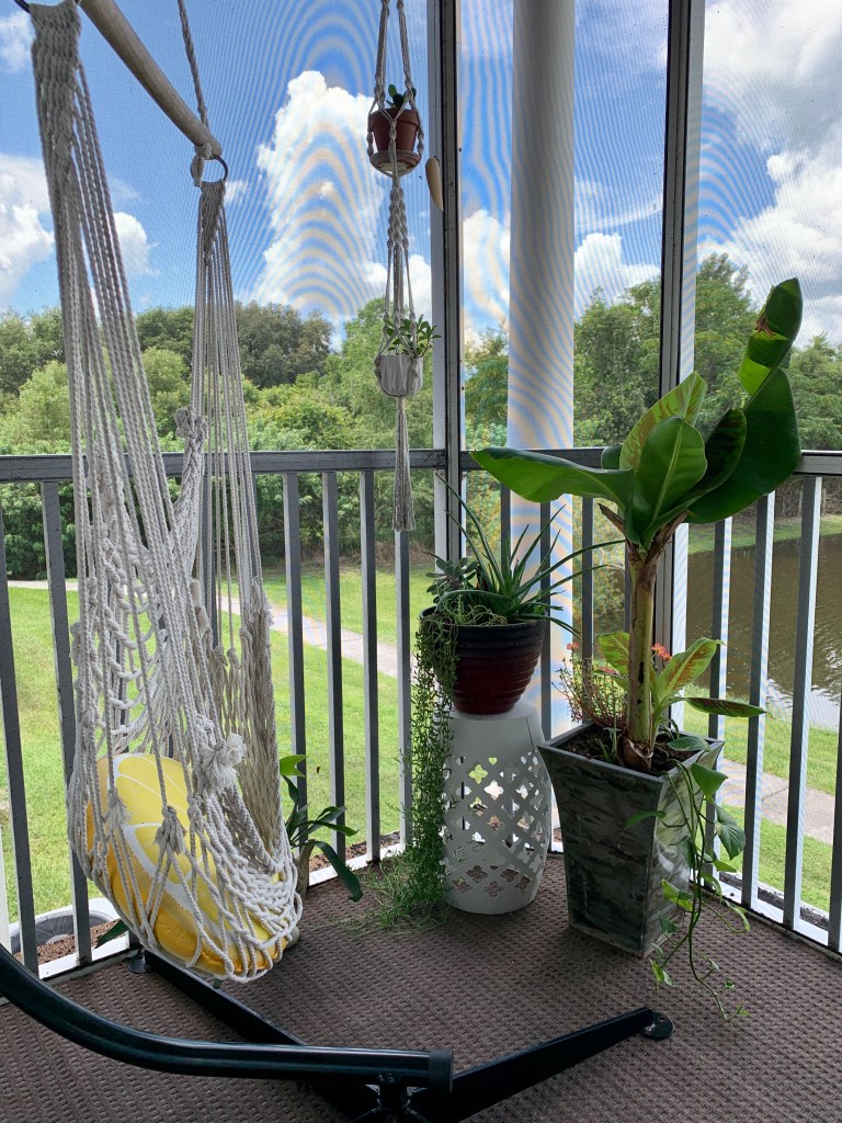 The balcony is my favorite place to relax, mostly because of my hanging chair. Several years ago, when we still lived in Ohio, Brian bought me two hammock chairs for Mother’s Day. Ashton and I sat in them everyday, reading and usually falling asleep, because seriously…so comfortable. I found this hanging chair frame on Amazon, and voila! Instant self-care center. Of course, the balcony is the ideal place for plants, and no space of mine is complete without them.