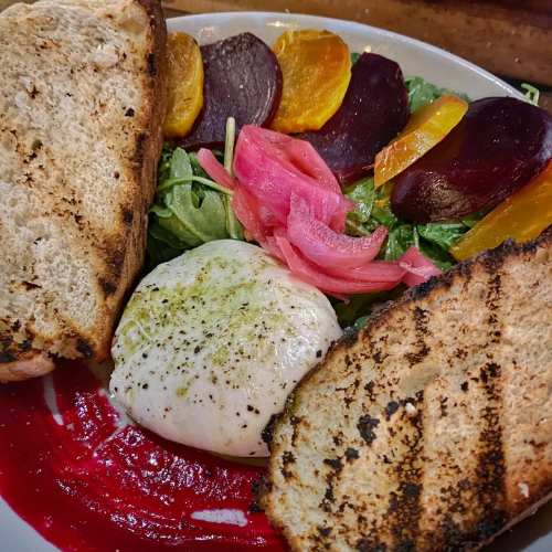 I’m going to walk you through assembling this salad, as opposed to actually giving you a recipe, because the components are simple and versatile. This is what I did: Start with whatever kind of salad greens you like. Spring mix is almost always my favorite for the variety in flavors and colors, but mostly anything would work here. The dressing tasted to me like a lemon vinaigrette, and I really wanted to recreate it using lemon curd, but B is having a sensitivity to eggs, so I used a basic vinaigrette this time. Dress the greens lightly and place each portion on the top half of the plate. (I used about 2 cups of greens for each portion.) Place roasted beets (alternating colors if you want to be fancy!) and pickled onions on top of greens. Swipe beet puree along bottom curve of plate and place a ball of mozzarella towards center of plate. *there’s a chance the salad at Southern Social had burrata instead of mozzarella. I couldn’t find burrata and I love fresh mozzarella, so that’s what I used. Season the cheese, toast your bread, and enjoy! I especially loved dipping the bread in the beet puree. Let me know what you think if you try it!!