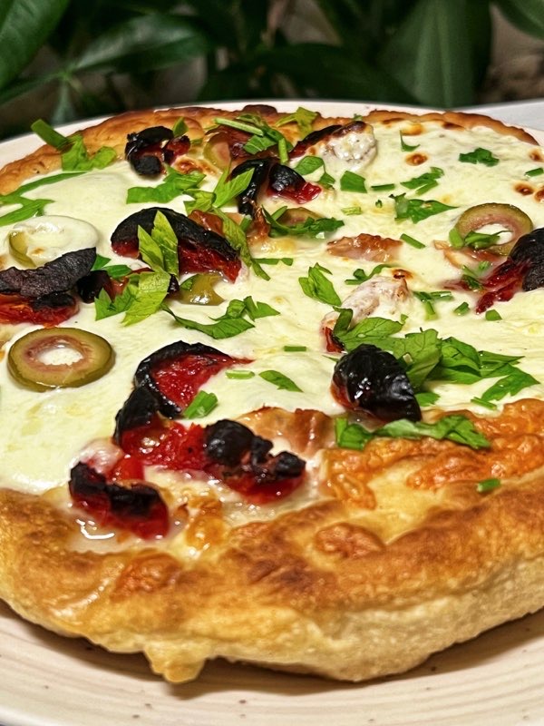 Ashton thought of these toppings himself and it turned out so good. We all love olives on pizza, but this is the first time we’ve tried sundried tomatoes and the charred crispy goodness was a delightful addition!