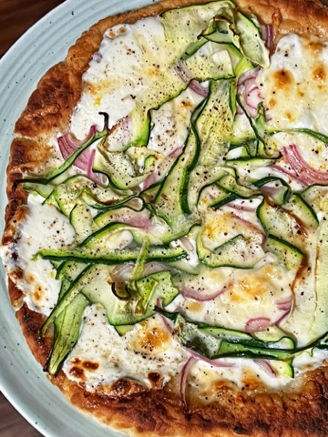 I just love those ribbons of zucchini! This pizza is unexpected, fresh, earthy, and delicious. This flavor combination was inspired by one of the offerings at Bonci Pizzarium in Rome. The second episode of “Chef’s Table: Pizza” is centered around Gabriele Bonci, and it’s not for the faint of heart. I found it fascinating, but I had to cover my eyes when he dismantled a skinned sheep. That’s all I’m going to say about that.